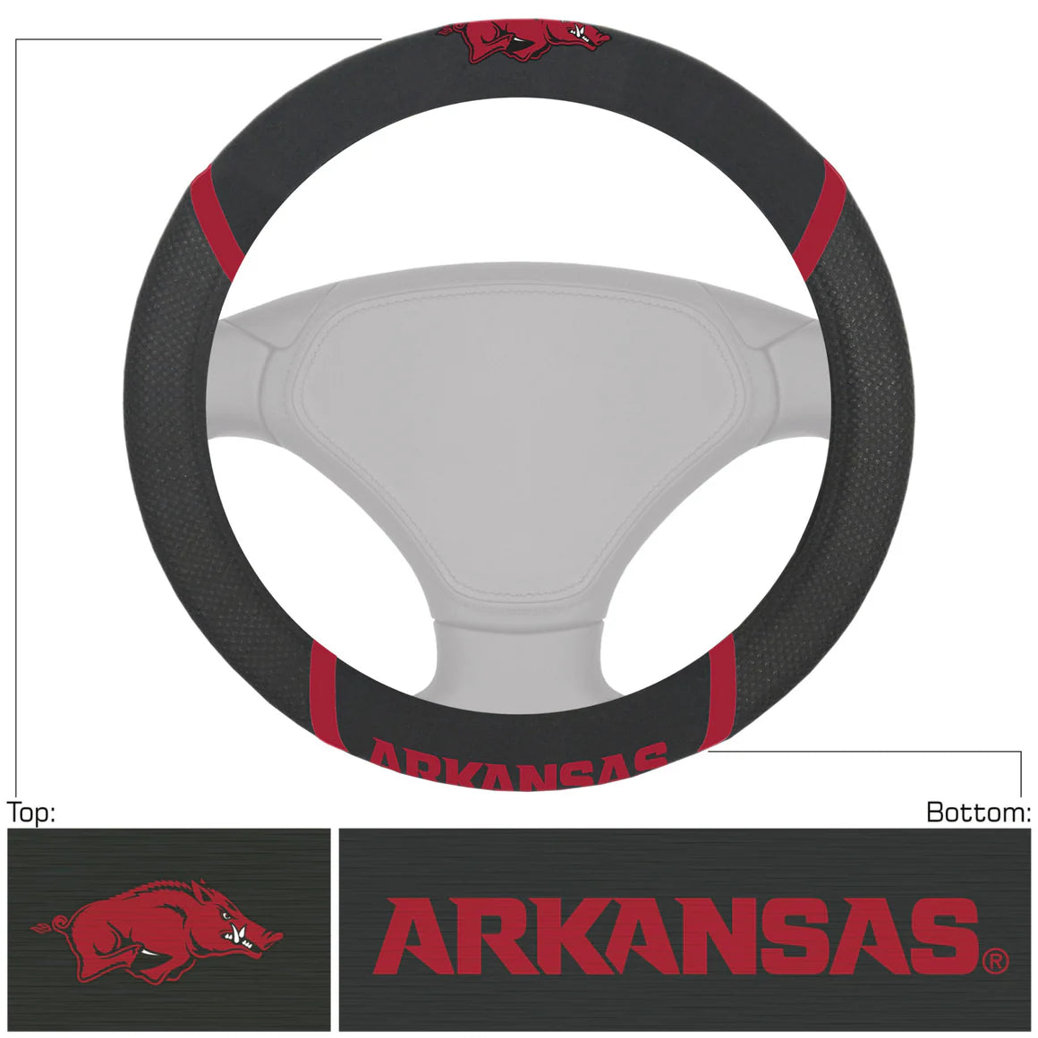 Add a special accent to your drive with a Arkansas Razorbacks Embroidered Steering Wheel Cover. Our covers are made with a combination of faux suede and fabric mesh they make the perfect accent to any interior. Not only does the suede and mesh add a touch of style, but also gives you extra grip while keeping your hands warm in the winter and cool in the summer. There are 2 logos on the cover the team’s primary logo is embroidered on the top and then teams name is on the bottom. We embroider the logos so that they will not peel or fade after use while driving. With a 15 inch diameter the covers are compatible with most vehicles, just set in the sun to soften the rubber core before installation.