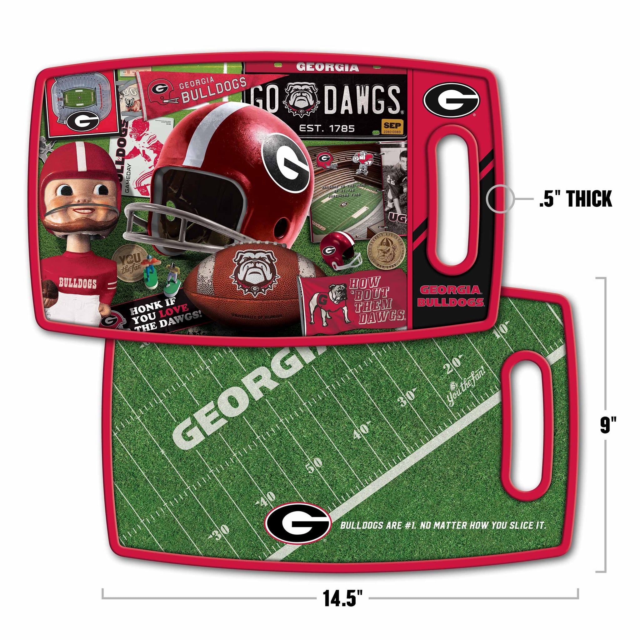Look back on your favorite team through the years with this retro series cutting board. Filled with memorabilia, vintage programs, bobbleheads and classic collectibles, each cutting board is designed to feature your team’s unique slogans and stadiums. The 14.5 in. x 9 in. surface is ideal for cutting and gentle on knives. Plus, your team is featured on both sides - double the surface, double the memories.