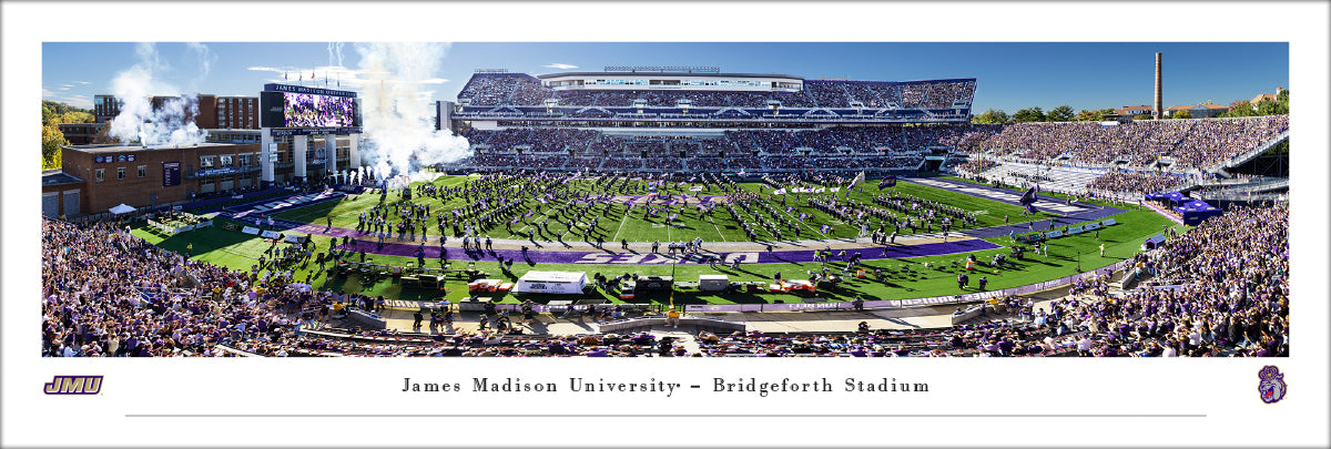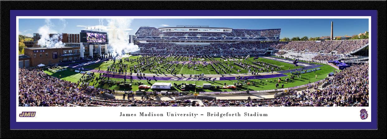 This panoramic photo captures the team runout as the JMU Dukes took to the field in front of a sold-out crowd prior to the opening kickoff of the homecoming game against Old Dominion at Bridgeforth Stadium in Harrisonburg, Virginia. With a dominant second half performance, the Dukes gained a season best 624 yards and rolled to a 63-27 victory to make this homecoming weekend memorable.