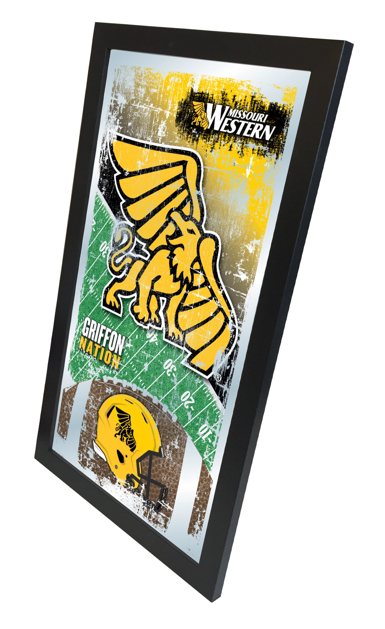 Show your school pride with this Official Licensed Football Mirror from the Holland Bar Stool Co.   With it's simple but elegant design, colors burst through the 1/8" thick glass and are highlighted by the mirrored accents.  Framed with a black, 1 1/4 wrapped wood frame with saw tooth hangers, this 15"(H) x 26"(W) mirror is ideal for your office, garage, or any room of the house.  Whether purchasing as a gift for a recent grad, sports super fan, or for yourself, you can take satisfaction knowing you're buying a mirror that is proudly Made in the USA.