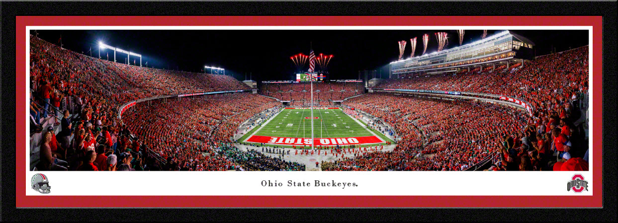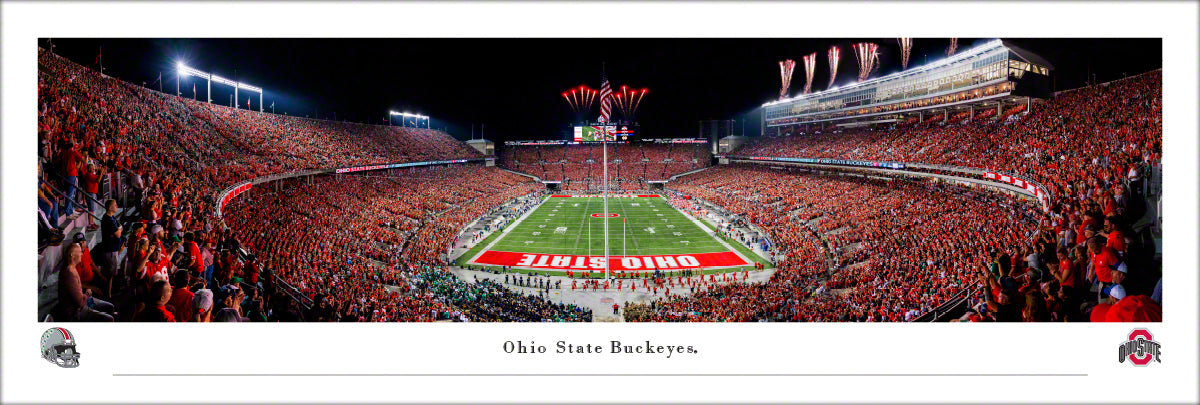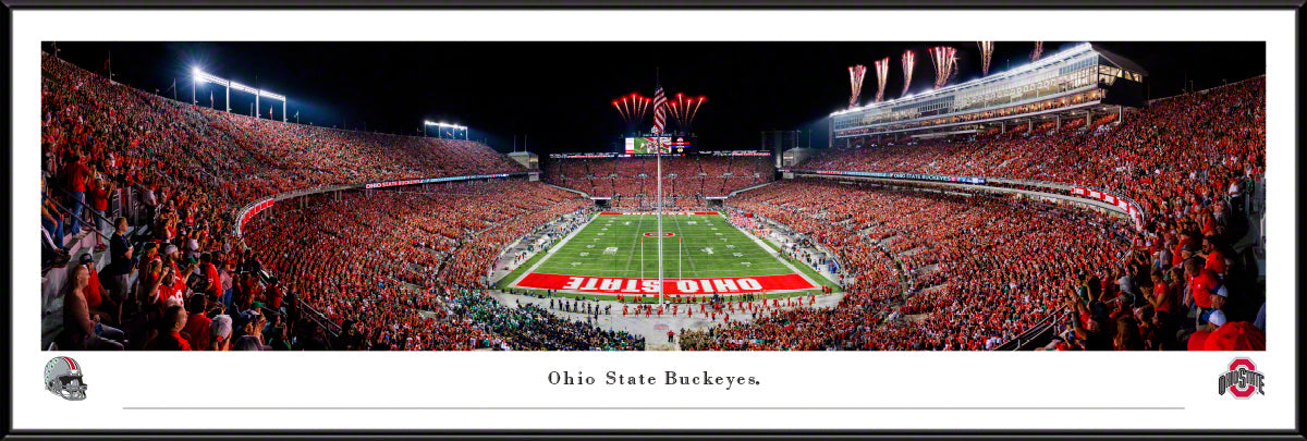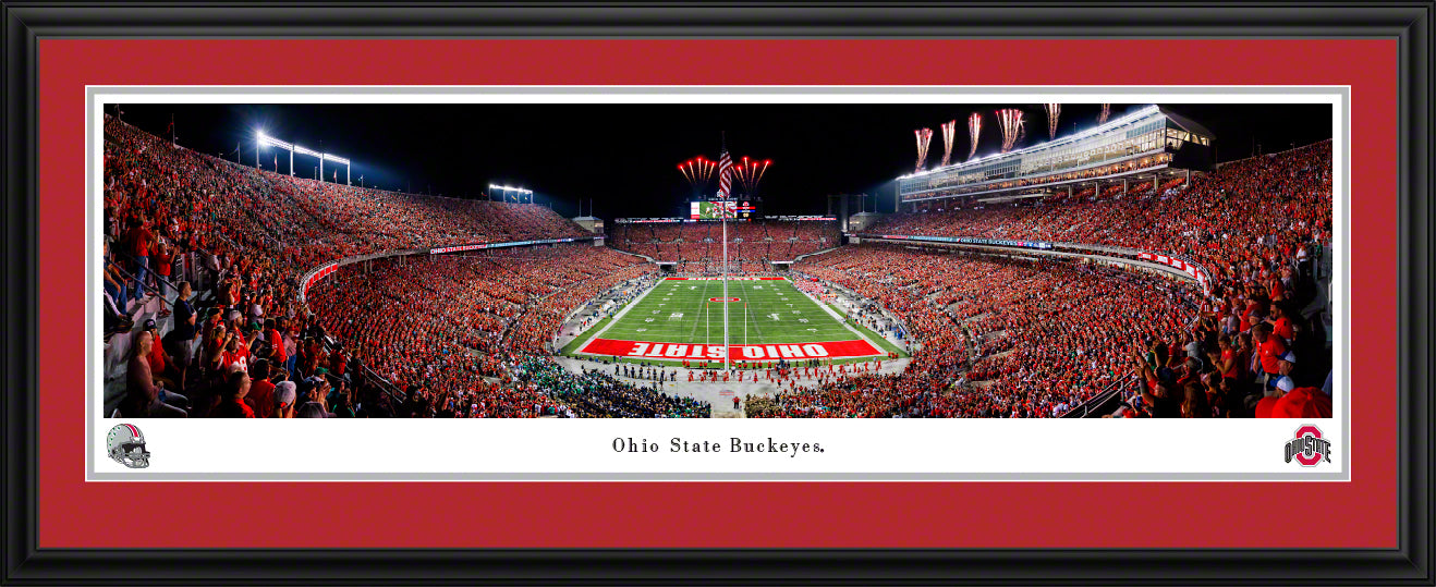 The panoramic photo captures an OSU touchdown during the home opener on September 3. 2022 as the Ohio State Buckeyes defeated the Notre Dame Fighting Irish 21-10 to begin their 100th season of football in Ohio Stadium. Affectionately known as the "Shoe", Ohio Stadium is one of the most recognizable landmarks in all of the sports. Since the opening game against Ohio Wesleyan on October 7, 1922, more than 36 million fans have streamed through the stadium's gates. With a seating capacity of 102,780, Ohio Stadium is one of the largest stadiums in the world, the fourth largest on-campus facility in the nation, and is listed in the National Register of Historic Places.