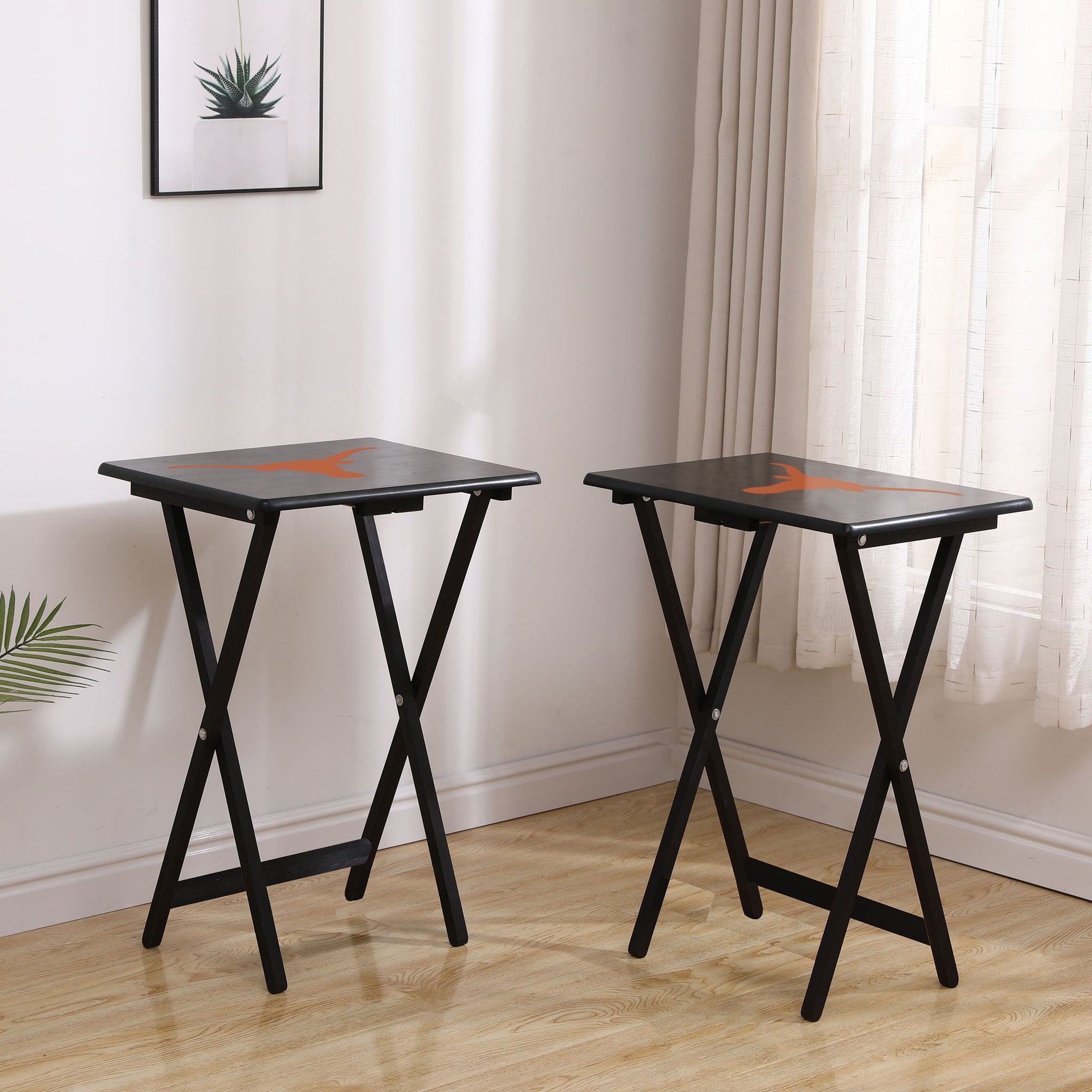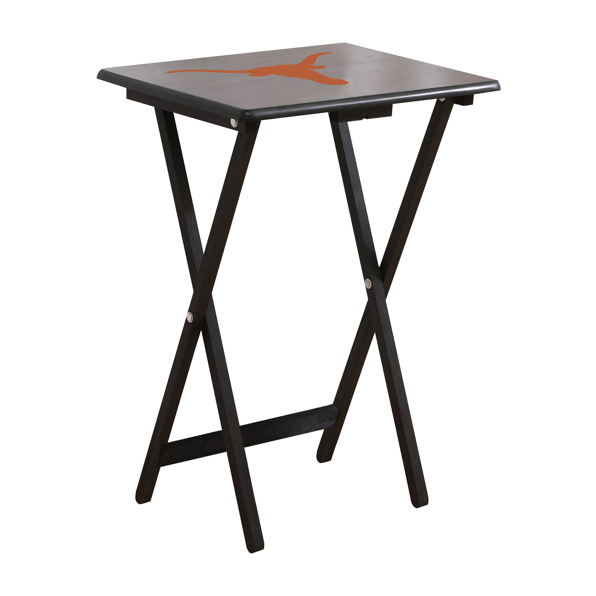 Show your team spirit with the Texas Longhorns Licensed TV Snack Tray Set. The heavy-duty trays and storage rack are made from select hardwoods that are finished with a durable, easy-to-clean surface so you don’t have to worry about stains. Team logos are silkscreened on the top of each tray. When you are done snacking, put the trays back into the storage rack to keep things neat and clean. Each tray measures 26"L x 19"W x 14.5"H. A Set of 4 snack trays and a storage rack are made to order.