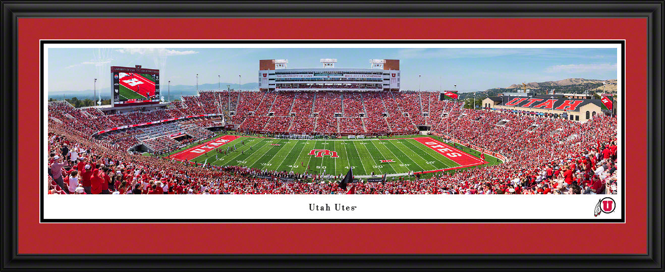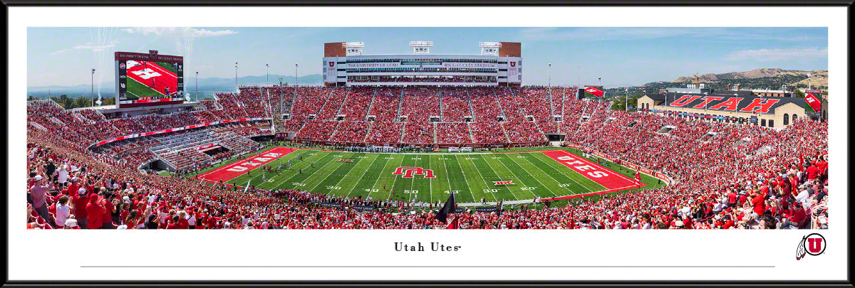 This panoramic photo captures a Utah Utes touchdown against the Baylor Bears at Rice-Eccles Stadium, where thanks to a dominant first half, the Utes went on to win the game 23-12. The Utes joined the Big 12 Conference in 2024 with high expectations for another winning season and a dedicated fan base with an impressive sell-out streak dating back to the 2010 season opener.