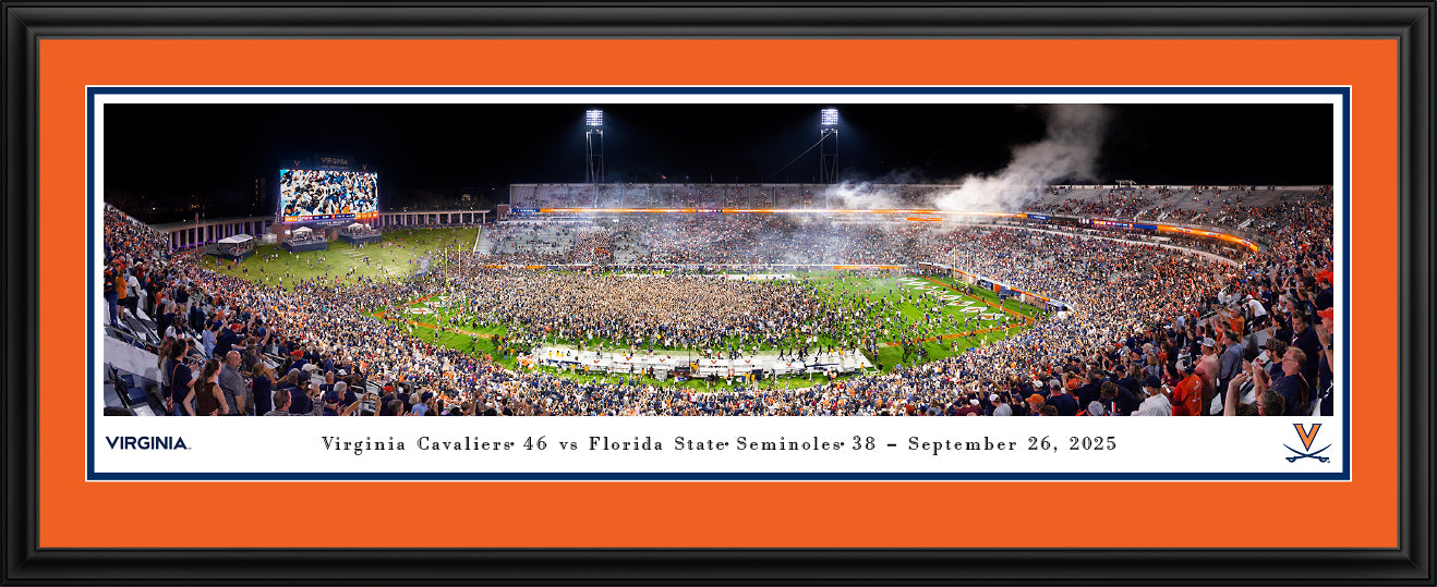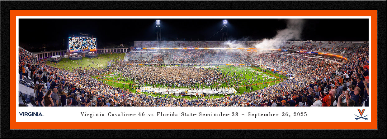 This panoramic photo captures jubilant Virginia fans storming the field at Scott Stadium in Charlottesville, Virginia, after the Virginia Cavaliers defeated the #8 Florida State Seminoles 46-38 in a double overtime thriller. The victory was the Wahoos’ first over a top-10 opponent at Scott Stadium since 2005. The crowd played a major role in the upset, Virginia players said. “There was a lot of Florida State people, but you could hear those Hoos just roaring.” “It was extremely loud, giving us energy.”