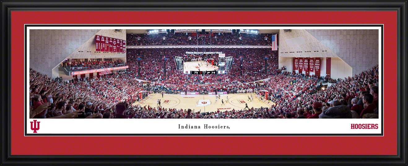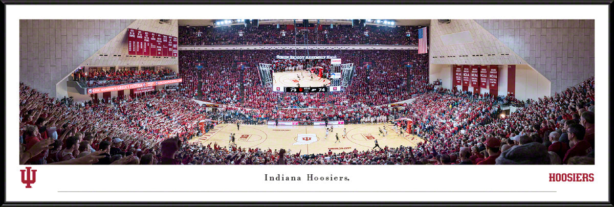 This panoramic photo features the dramatic slam dunk that sealed the victory for Indiana with only 2 seconds remaining in the game as the Hoosiers upset Big 10 rival and #1 ranked Purdue Boilermakers at Simon Skjodt Assembly Hall in Bloomington, Indiana. The Hoosiers led throughout the game, securing a 79-74 victory over the Boilermakers in front of an ecstatic crowd. Hoosier fans had much to celebrate as this was IU's first win against the top-ranked team in a decade.
