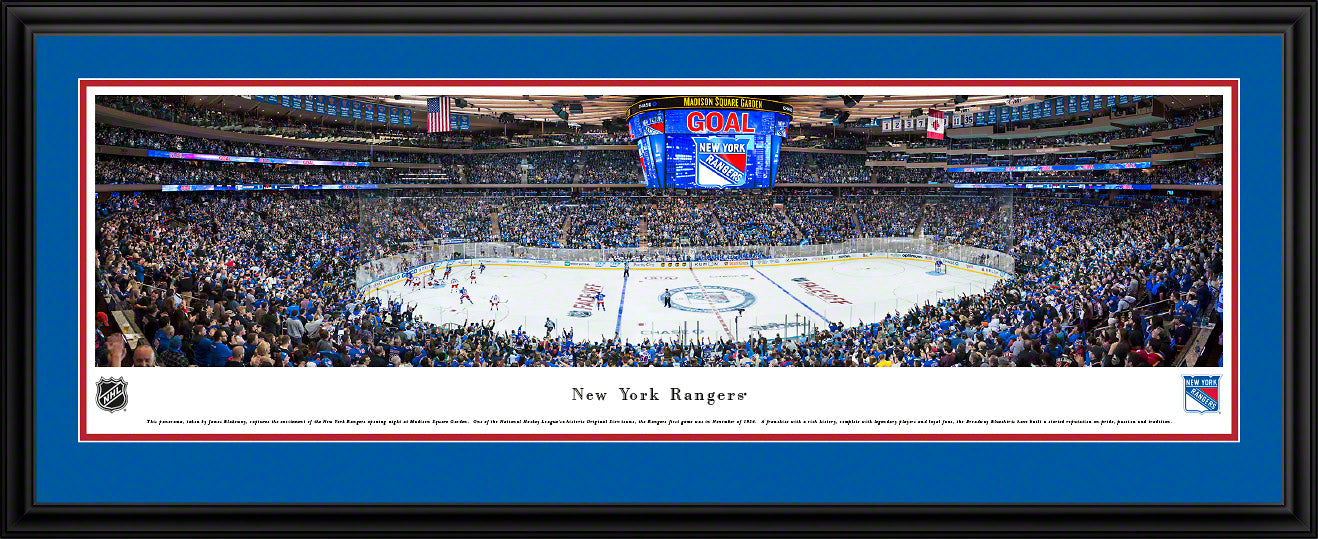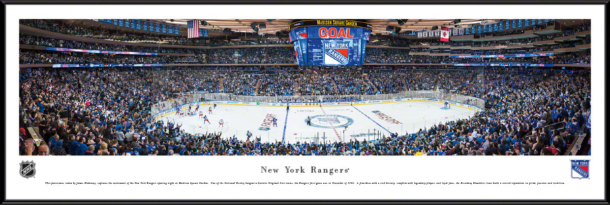 This panorama, taken by James Blakeway, captures the excitement of opening night hockey as the home team, the New York Rangers®, take to the ice to kick-off their season. One of the National Hockey League®'s historic Original Six™ teams, the Rangers began their illustrious career in 1926. The team's trademark red, white and blue logo and uniform, originally designed to signify their American patriotism, has changed little since then. The club enjoys the proud achievement of having been the first team to ever win the Stanley Cup®, as well as counting amongst their ranks some of the most respected players in league history.