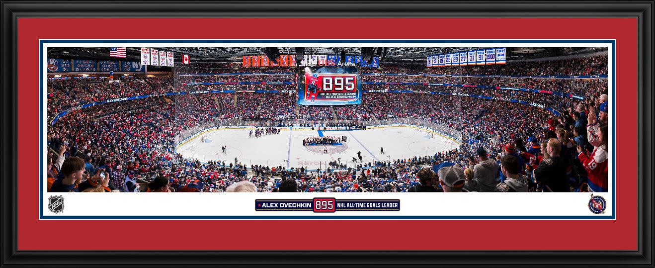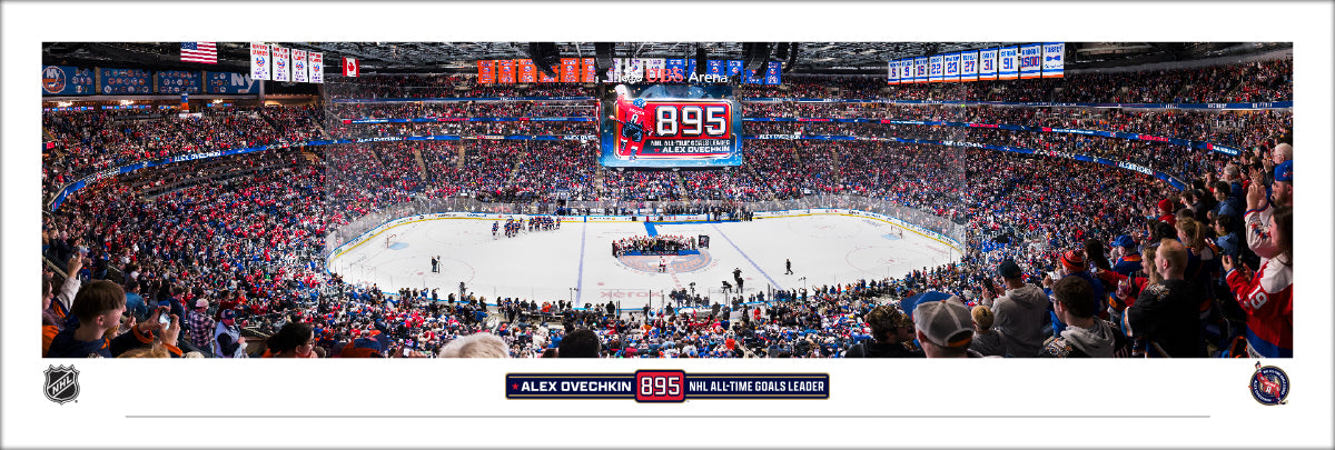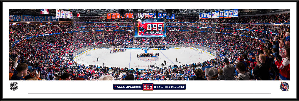 This panoramic photo, taken on April 6, 2025, captures the NHL Ceremony celebrating Alex Ovechkin as the new NHL All-Time Goals Leader. The NHL paused the game for over ten minutes after Ovechkin scored goal number 895, to celebrate the breaking of Wayne Gretzky’s career regular season goal record. Ovechkin’s mother, wife, children, NHL Commissioner Gary Bettman, and the Great One, Wayne Gretzky, joined him on ice for the mid-game ceremony. Ovechkin set the all-time scoring record in his 20th NHL season, playing in 1,487 games.