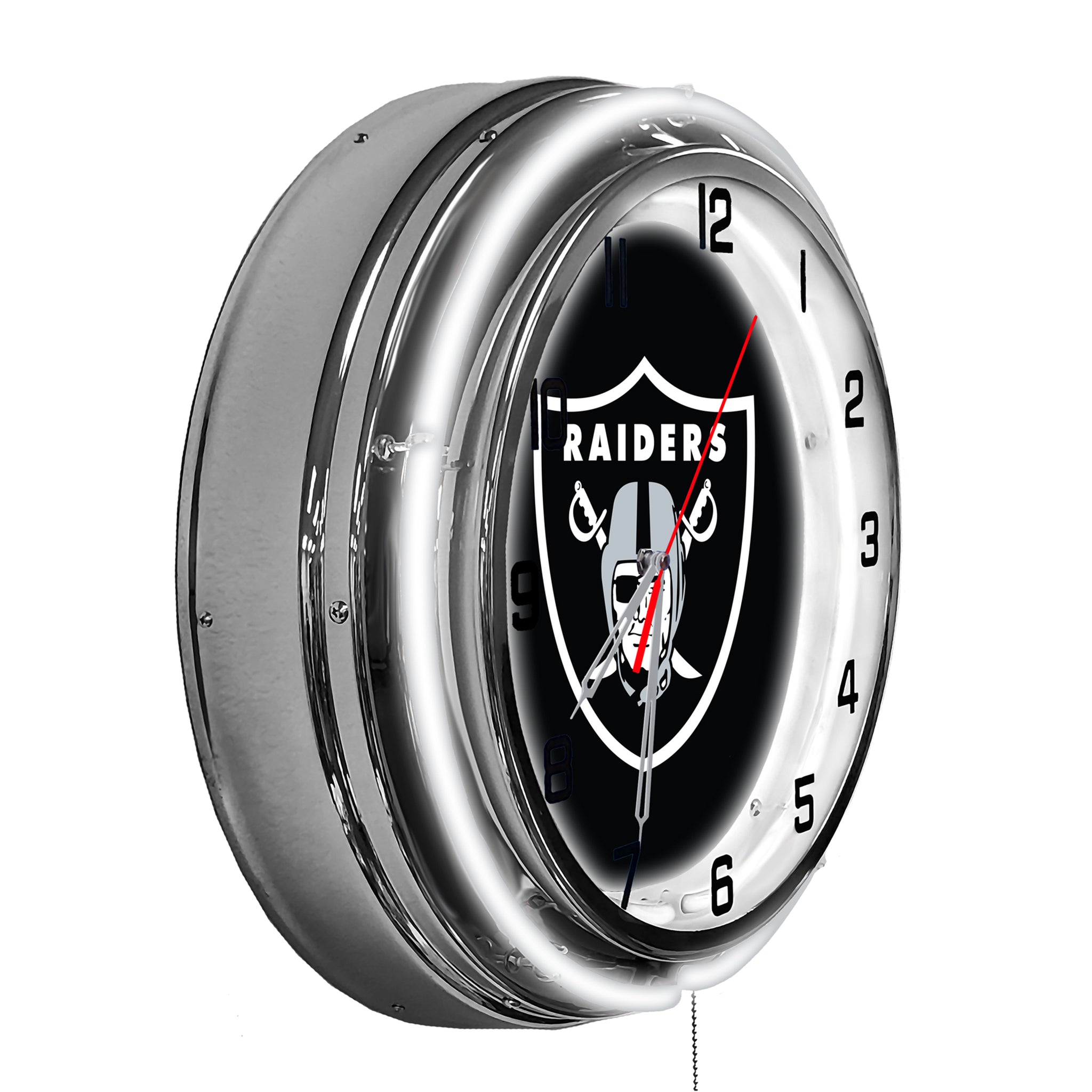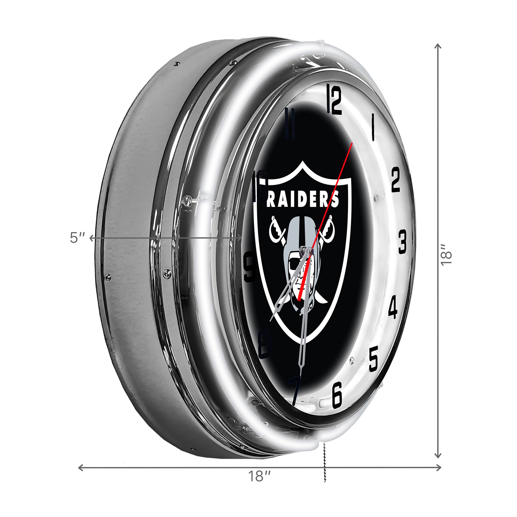 Make Your Fan Room Or Office Glow With Your 18" Las Vegas Raiders Neon Clock. Inner Band Of Neon Is White To Brighten The Face Of The Clock And the Outer Band Focuses On Your Favorite Team's Color. Perfect Gift For That Distinguished Fan!